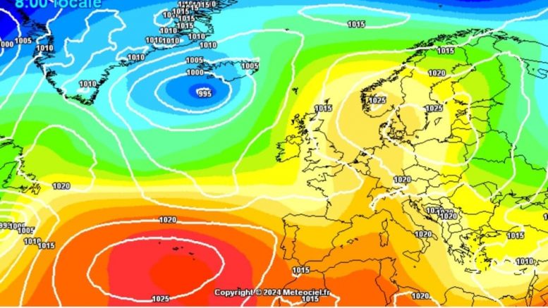 Nell’immagine la pressione in quota e al suolo per sabato pomeriggio, fonte meteoblue.com