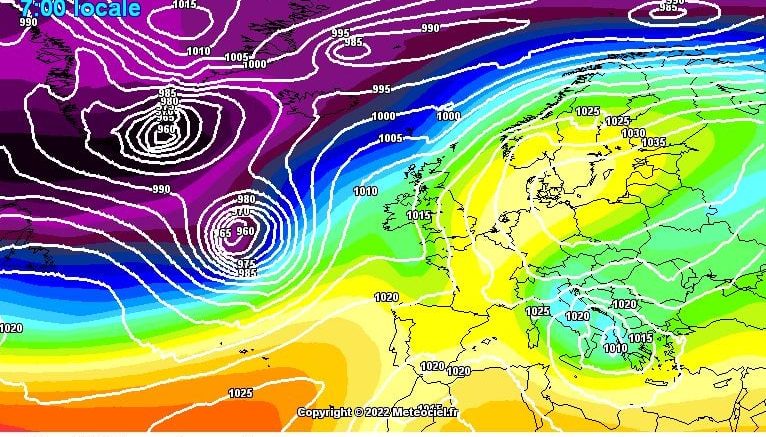 Nell’immagine la pressione in quota ed al suolo prevista per domenica mattina (GFS by meteociel.fr)