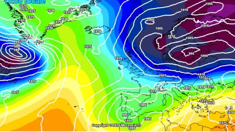 Nell’immagine la pressione in quota e al suolo prevista per domenica mattina (ICON DWD by meteociel.fr)