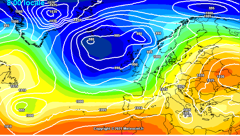 Nell’immagine la pressione in quota e al suolo prevista per domenica mattina (GFS by meteociel.fr)