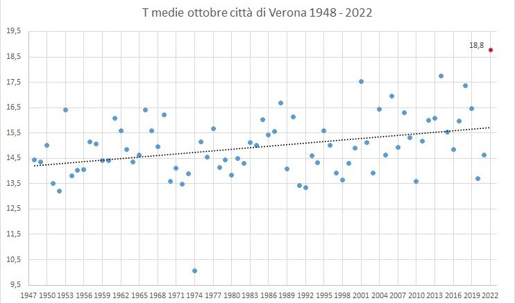 Immagine: temperature medie per il mese di ottobre nel periodo 1948 – 2022 per la città di Verona.