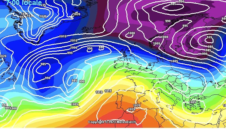 Nell’immagine la pressione in quota e al suolo prevista per domenica mattina (GFS by meteociel.fr)