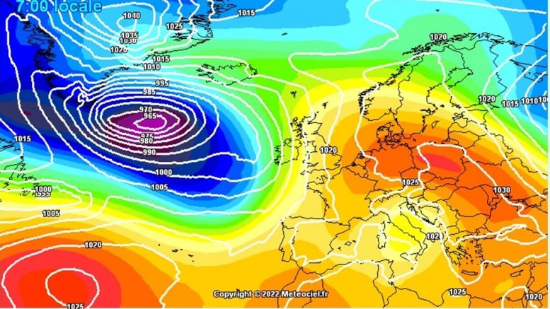 Nell’immagine la pressione in quota e al suolo prevista per domenica mattina (GFS by meteociel.fr)