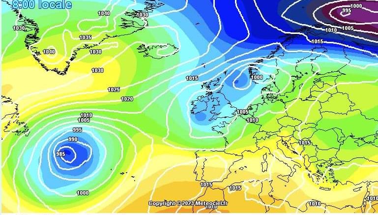 Nell’immagine la pressione in quota e al suolo prevista per domenica mattina (GFS by meteociel.fr)