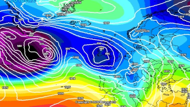 Nell’immagine la pressione in quota e al suolo prevista per domenica mattina (ICON DWD by meteociel.fr)