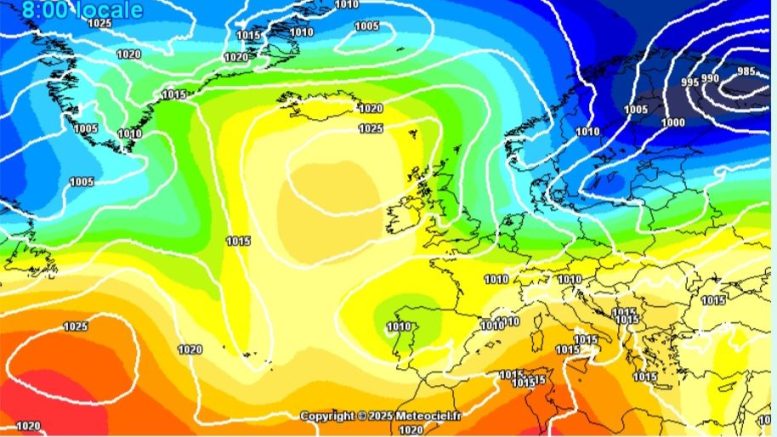 Nell’immagine la pressione in quota ed al suolo prevista per domenica mattina (ICON DWD by meteociel.fr)
