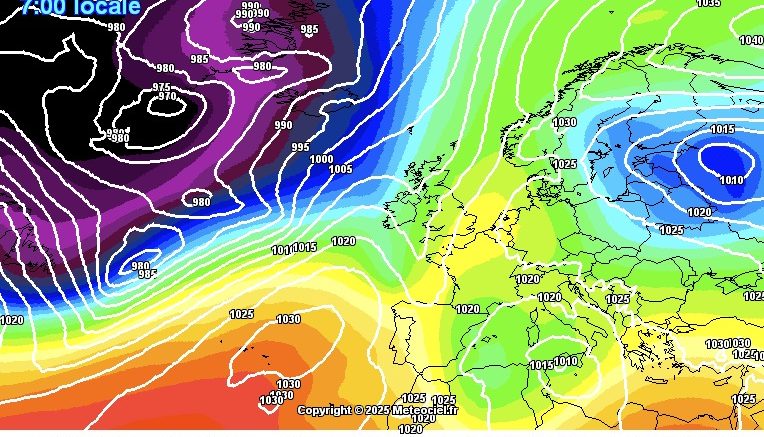 Nell’immagine la pressione in quota ed al suolo prevista per domenica mattina (ICON DWD by meteociel.fr)