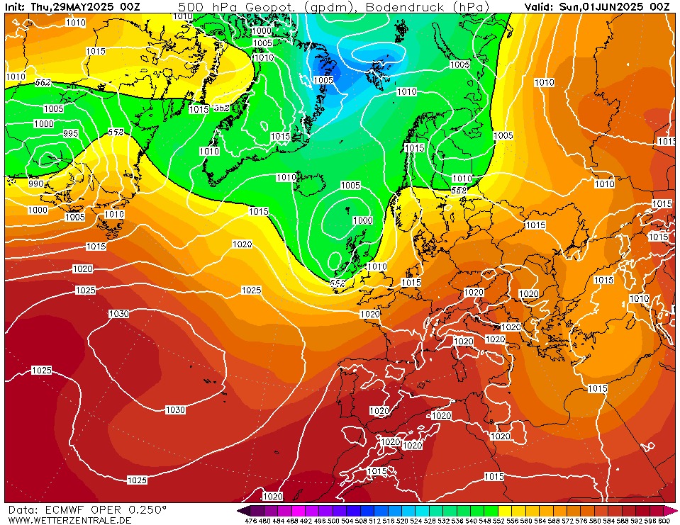 Nel bacino del Mediterraneo si estende un braccio di alta pressione sub tropicale con cuore continentale caldo. Questa figura pare al momento, transitoria, pertanto ci protegge per tutto il fine settimana, poi dovrebbe giungere aria più umida e fresca atlantica.
