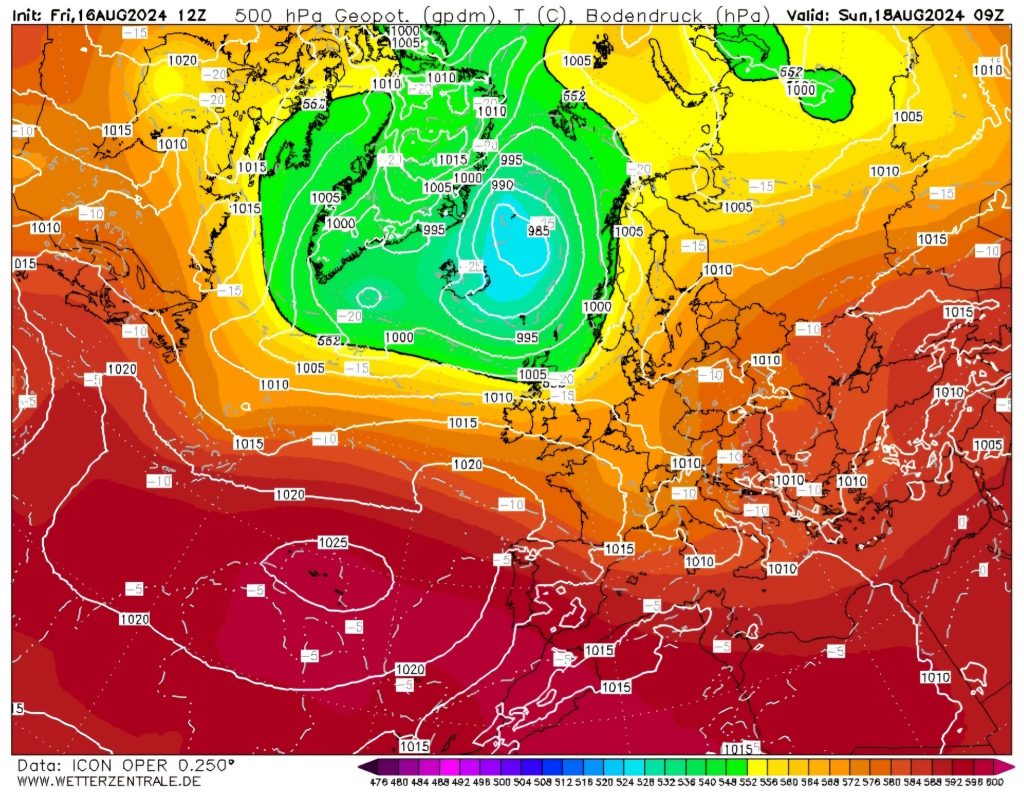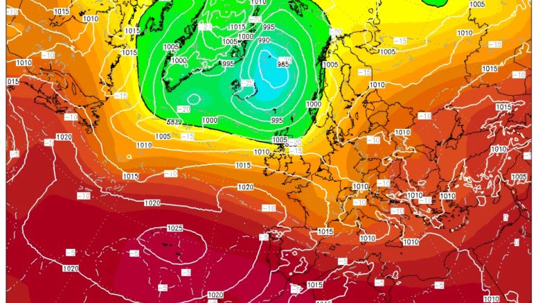 Nell’immagine la pressione in quota ed al suolo prevista per domenica mattina (ICON DWD by meteociel.fr)