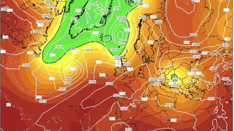 Nell’immagine la pressione in quota e al suolo prevista per domenica mattina (ICON DWD by wetterzentrale.de)