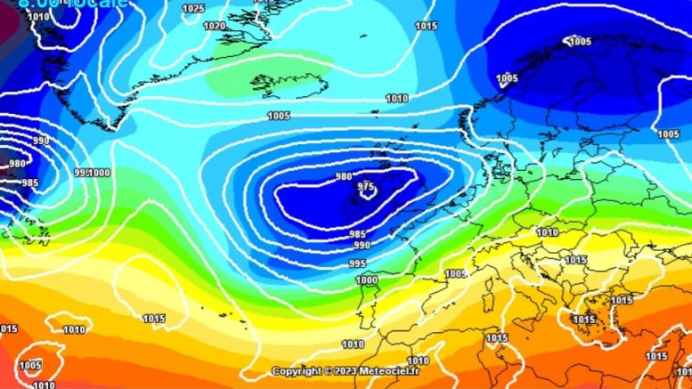 Nell’immagine la pressione in quota e al suolo prevista per domenica mattina (GFS by meteociel.fr)
