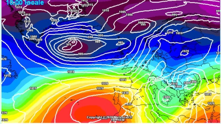 Nell’immagine la pressione in quota ed al suolo prevista per domenica mattina (ICON DWD by meteociel.fr)