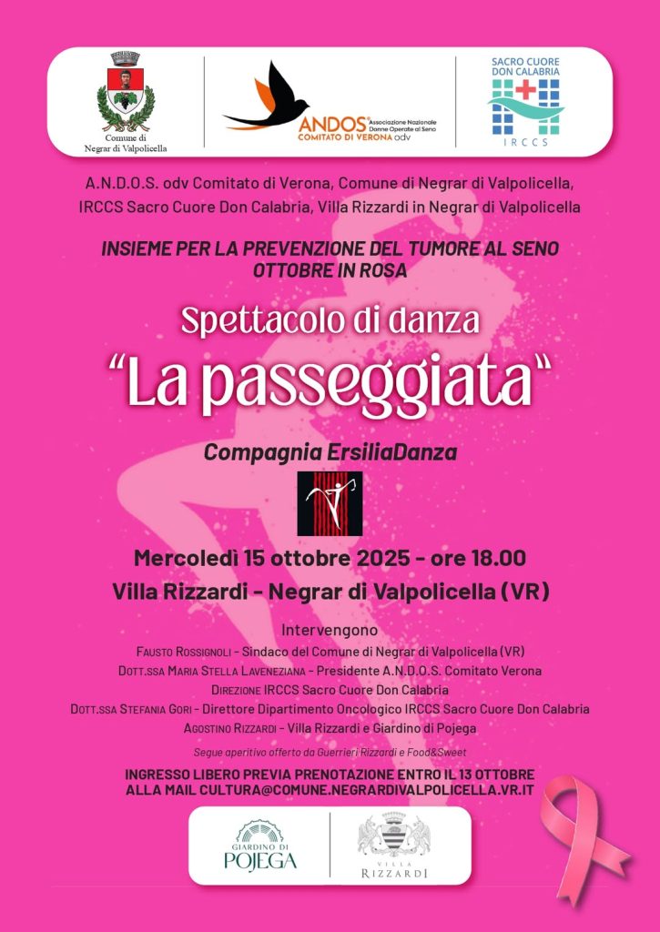 Prevenzione e la solidarietà si uniscono in uno spettacolo di danza a Negrar di Valpolicella: mercoledì 15 ottobre alle ore 18 a Villa Rizzardi un evento “Rosa”. Questo è promosso da A.N.D.O.S. odV Comitato di Verona, in collaborazione con il Comune di Negrar, l’IRCCS Sacro Cuore Don Calabria e Villa Rizzardi, nell’ambito della campagna “Insieme per la prevenzione del tumore al seno – Ottobre in Rosa”.
