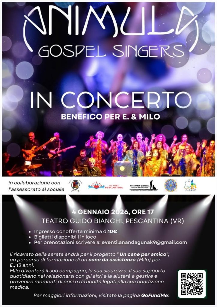 Gospel e solidarietà a Pescantina: tutto pronto per il concerto che guarda al futuro della piccola “E” e del suo cane da assistenza Milo. Domenica 4 gennaio 2026, il Teatro “Guido Bianchi” di Pescantina ospiterà un evento speciale: il concerto benefico degli Animula Gospel Singers. L’appuntamento, previsto per le ore 17, è organizzato in collaborazione con l’Assessorato al Sociale del Comune di Pescantina.