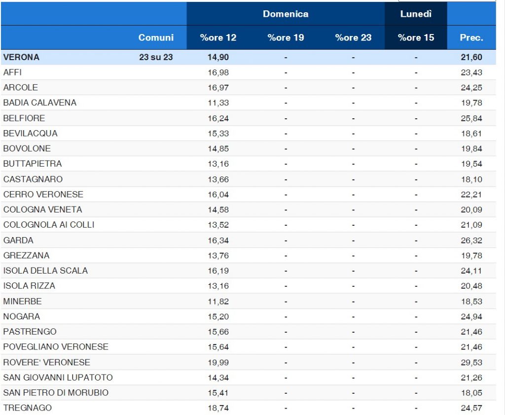 Le percentuali di maggior affluenza le hanno registrate i comuni di Riverà Veronese, con il 19,99%, e Tregnago, con il 18,74%. L’affluenza più bassa invece a Badia Calavena, con l’11,33%.
