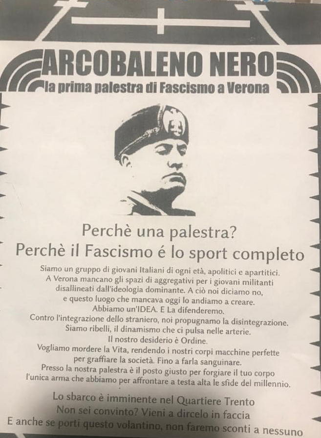 Nelle cassette delle lettere di Borgo Trento, a Verona, è improvvisamente comparso un volantino di chiara matrice fascista. E in città scoppia la polemica. Il volantino, che riporta la faccia inequivocabile di Benito Mussolini e la testata “Arcobaleno nero”, in un italiano abbastanza incerto e sgrammaticato propone la non meglio precisata realizzazione di una “palestra per il fascismo”. Con frasi come: “Lo sbarco è pronto nel quartiere Trento. Non sei convinto? Vieni a dircelo in faccia” e altre con toni simili.