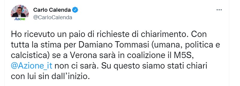 E tra questi compare anche Francesca Businarolo, deputata del Movimento 5 Stelle, a pochi passi da Marco Wallner, responsabile veronese di Azione, il movimento di Carlo Calenda. Tutti e due per Tommasi, insieme. Troppo, per Carlo Calenda. Che ieri ha annunciato con un tweet che non ha nessuna intenzione di condividere il candidato sindaco con i 5 Stelle. O noi o loro, in sostanza. “Con tutta la stima per Damiano – umana, politica e calcistica – se a Verona sarà coalizione col M5S , Azione non ci sarà. Su questo siamo stati chiari con lui sin dall’inizio”, scrive Calenda.