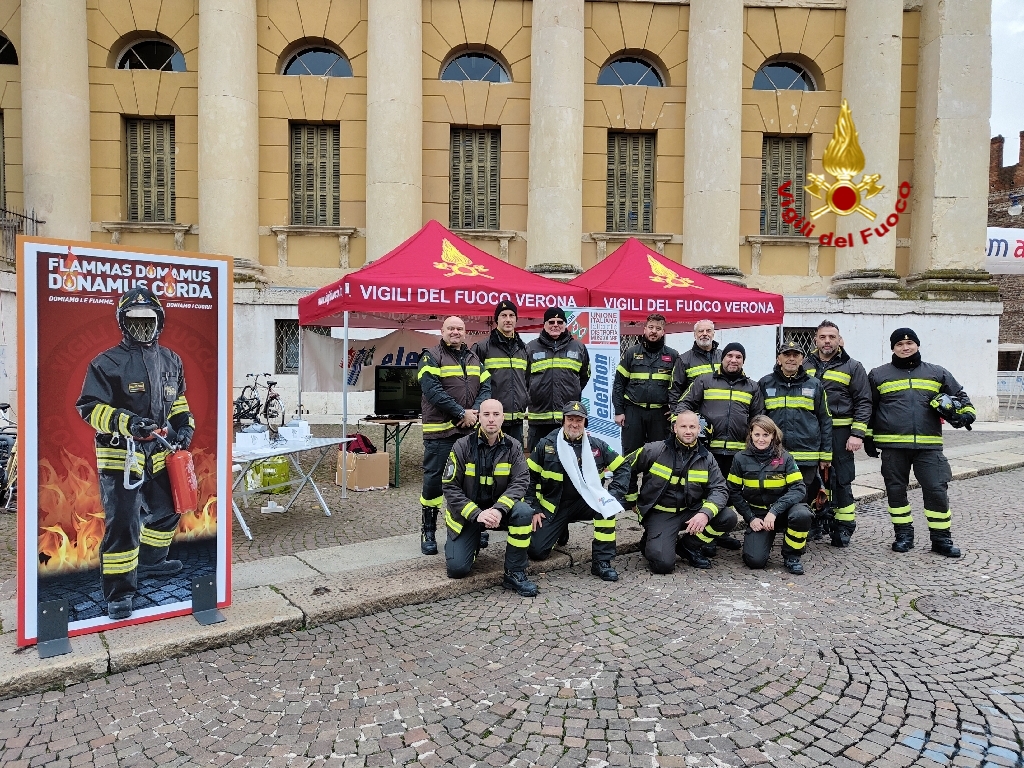 Il personale dei vigili del fuoco, presente in piazza Bra con un’esposizione di mezzi e attrezzature, ha allestito uno stand e un’area con alcune attività ludiche tra le quali una salita con scala mista e discesa lungo un tubo da 45mm appositamente gonfiato con aria, una visione in realtà virtuale delle attività dei vigili del fuoco con speciali visori 3D, e la possibilità di accedere all’interno di una APS.