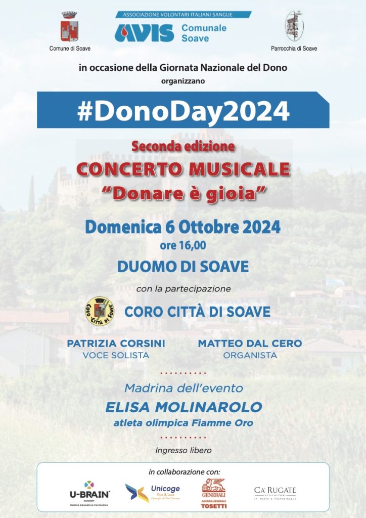 Anche quest’anno, in occasione della Giornata Nazionale del Dono, l’Avis di Soave organizza il #Donoday 2024: madrina, Elisa Molinarolo. Per l’occasione presenterà la seconda edizione del concerto musicale “Donare è gioia”.