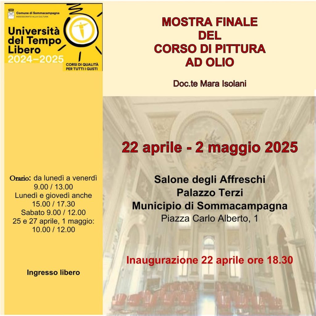 Dal 22 aprile al 2 maggio, nella Sala degli Affreschi del Comune di Sommacampagna, si potranno ammirare i quadri realizzati dagli allievi del corso di pittura a olio dell’Università del Tempo Libero.