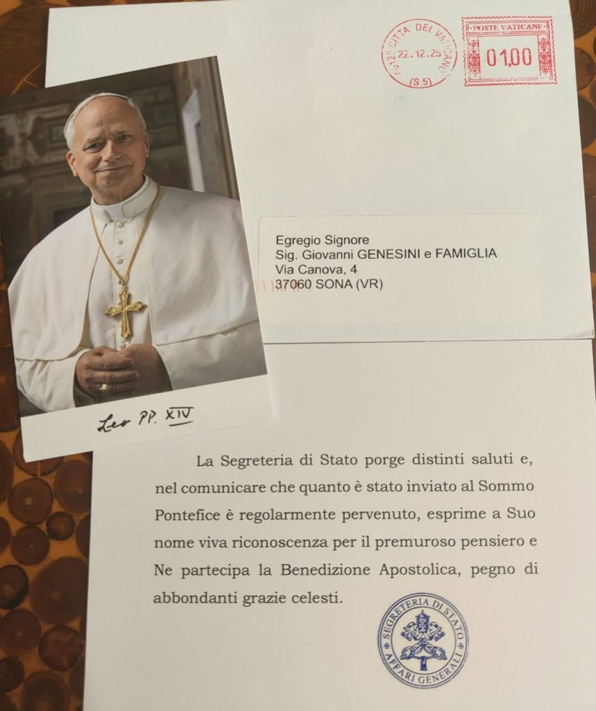 Nella lettera, inviata a nome del Sommo Pontefice, la Segreteria di Stato conferma la regolare ricezione dell’opera inviata dall’artigiano — un tagliere finemente lavorato che ritrae Papa Leone — esprimendo “viva riconoscenza per il premuroso pensiero“. La missiva, indirizzata a Genesini e alla sua famiglia, non si limita a un semplice ringraziamento formale, ma comunica la partecipazione della Benedizione Apostolica, definita come “pegno di abbondanti grazie celesti“. Questo scambio epistolare, è stato timbrato dalle Poste Vaticane il 22 dicembre 2025.