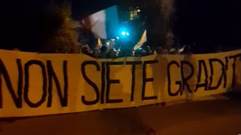 La manifestazione è iniziata alle 20.30 con un corteo che dalle scuole di via Carducci ha raggiunto l’hotel in via Stazione: elementare lo slogan riassunto da un grande striscione: “Non siete graditi”.