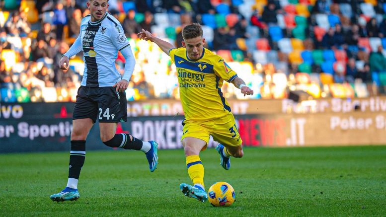 Per questa sfida Baroni si affida a Ngonge-Suslov-Lazovic a supporto di Djuric, in mezzo al campo Folorunsho e Duda, Coppola al posto di Hien in difesa insieme a Tchatchoua, Amione e Terracciano. Tra i pali Montipò. Sedici minuti di gioco e l’Udinese va già in gol: punizione tagliata di Samardzic, Kabasele sottomisura devia in fondo al sacco. Al 21esimo Verona vicina al pareggio con Coppola che svetta in area, il suo colpo di testa sfiora la traversa, ma alla mezz’ora sono ancora i padroni di casa ad andare in rete: Pereyra pesca il taglio in area di Lucca che di destro tocca alle spalle di Montipò. Al 36esimo Suslov vince la sfida in velocità con Perez, Kabasele stoppa con la mano il destro di Ngonge, Maresca indica il dischetto. Rasoterra preciso di Djuric dagli 11 metri, Silvestri indovina l’angolo ma non ci arriva. Prima dell’intervallo occasione per i friulani: punizione di Samardzic, il suo sinistro aggira la barriera, Montipò ci mette i pugni.