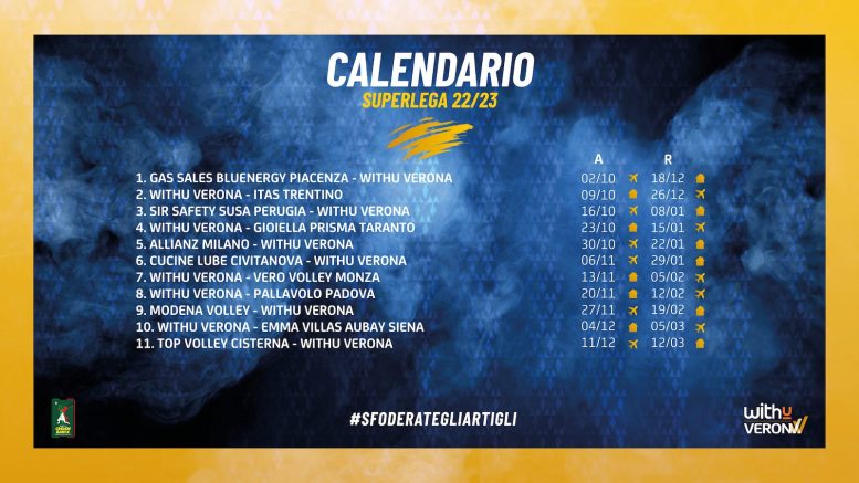 I primi due grandi appuntamenti della stagione andranno in scena nelle successive due uscite. Il debutto casalingo avverrà il 9 ottobre contro l’Itas Trentino, mentre sette giorni più tardi faremo visita alla Sir Safety Susa Perugia. Il 6 novembre 2022 Verona giocherà in casa della Cucine Lube Civitanova. Il 27 novembre, invece, saremo di scena sul terreno di gioco di Modena Volley.
