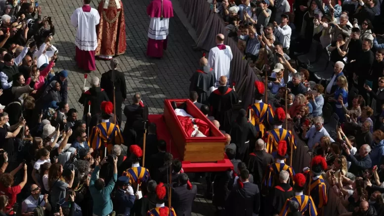 CITTA’ DEL VATICANO (ITALPRESS) – Si è svolto il rito della traslazione della salma di Papa Francesco dalla Cappella della Domus Santa Marta alla Basilica di San Pietro, secondo quanto previsto nell’Ordo Exsequiarum Romani Pontificis. Dopo il momento di preghiera, presieduto dal cardinale Kevin Joseph Farrell, Camerlengo di Santa Romana Chiesa, è iniziata la processione dalla Cappella della Domus, con i Cardinali e i Patriarchi, seguiti dal Cardinale Camerlengo e dal Maestro delle Celebrazioni. I Barellieri-Sediari hanno portato la bara del defunto Pontefice, seguiti dai Segretari, Familiari e anticamera.