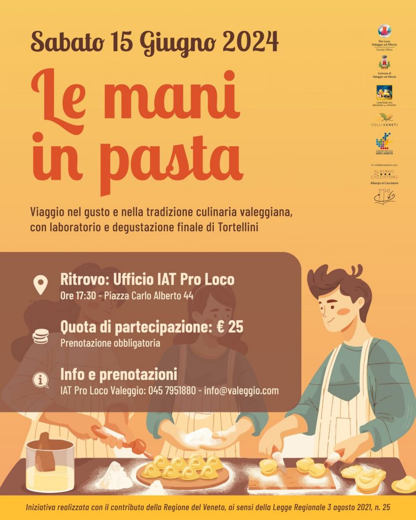 Sabato 15 giugno a Valeggio, un evento speciale intitolato “Le mani in pasta”: un viaggio alla scoperta del gusto e della tradizione dei tortellini. Per imparare a fare il “nodo” ci sarà un laboratorio dedicato ai tortellini con degustazione finale.