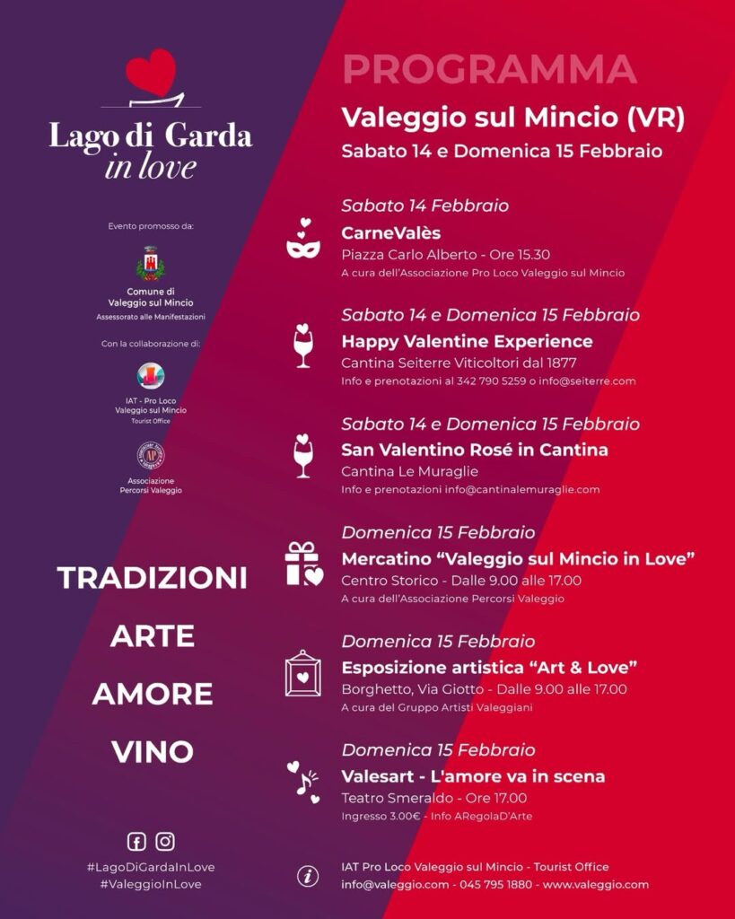 Il weekend di San Valentino si preannuncia speciale a Valeggio sul Mincio, grazie alla rassegna “Lago di Garda in Love”. Sabato 14 e domenica 15 febbraio, il borgo si vestirà di rosso per celebrare l’unione tra tradizioni locali, arte e l’eccellenza vinicola del territorio.