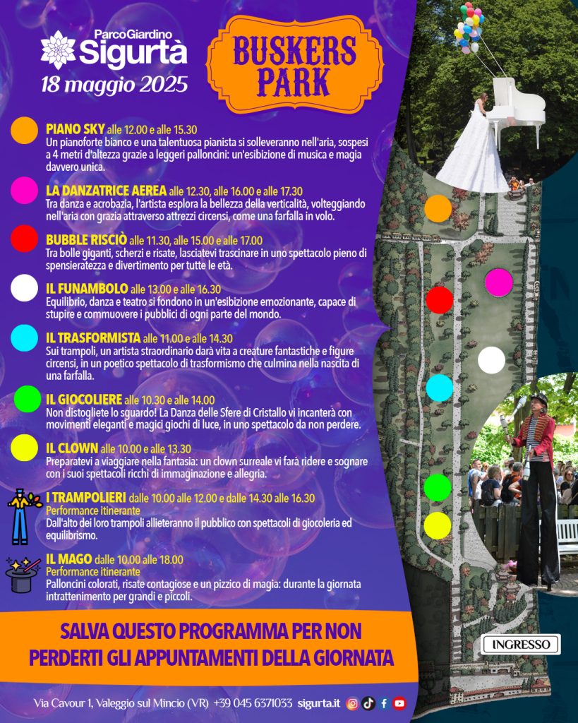 Domenica 18 maggio dalle 10 alle 18 torna Buskers Park, l’evento dedicato all’arte di strada, decima edizione, che trasformerà il parco di Valeggio sul Mincio in un teatro a cielo aperto.