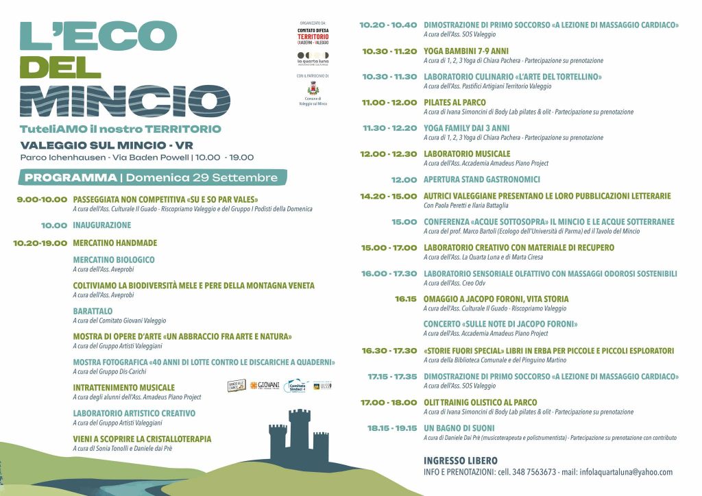 Valeggio sul Mincio: il 29 settembre l’evento “L’Eco del Mincio: Tuteliamo il nostro territorio” è al parco Ichenhausen. Il programma sarà ricco di attività in azione dalle 9 alle 19. L’iniziativa è organizzata dal Comitato Difesa Territorio e patrocinata dal Comune di Valeggio sul Mincio, con lo scopo di promuovere la tutela ambientale e valorizzare le risorse del territorio.