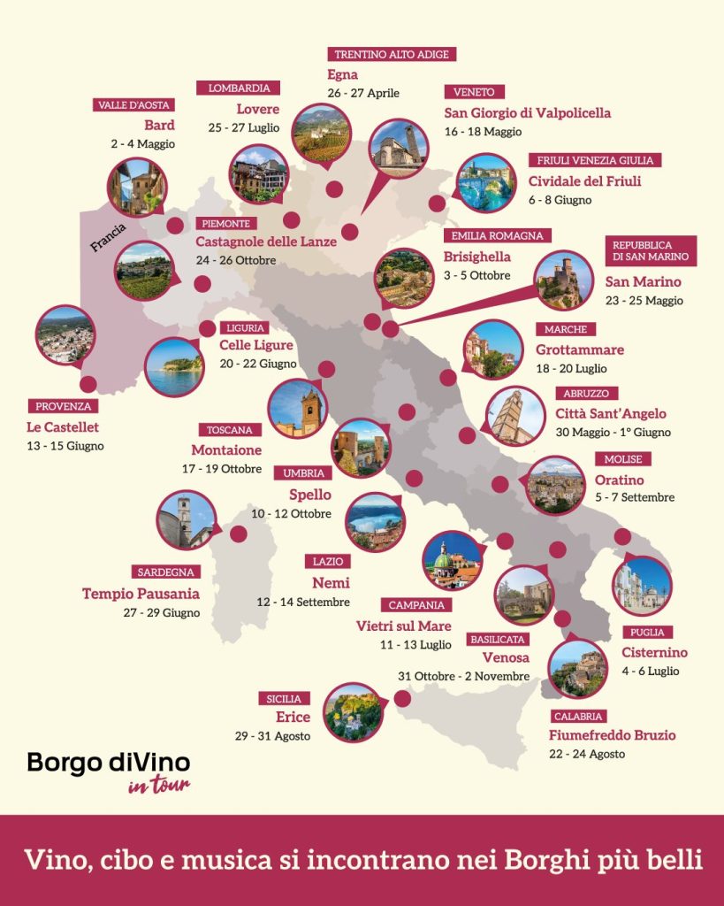 Per l’edizione 2025, la manifestazione cresce ancora: 22 tappe totali, tra cui due novità internazionali con eventi a San Marino e Le Castellet, borgo certificato tra i “più belli di Francia”. La rassegna si conferma così l’unico evento sul vino che attraversa l’intero territorio italiano, coinvolgendo alcuni tra i Borghi più belli d’Italia.