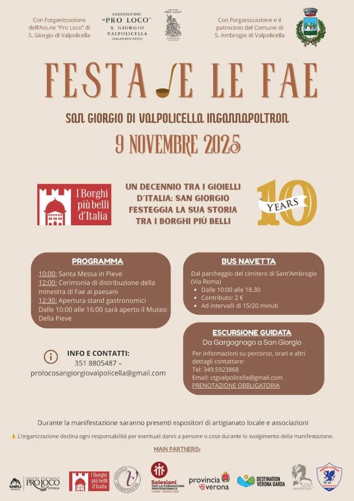 Il borgo di Ingannapoltron in Valpolicella, celebra una data importante con la tradizionale “Festa de le Fae”, ossia la festa delle fave. L’evento, in programma per domenica 9 novembre 2025, non sarà solo una celebrazione del gusto, ma anche il festeggiamento del decennale dall’ingresso di San Giorgio di Valpolicella nell’associazione “I Borghi più belli d’Italia”.