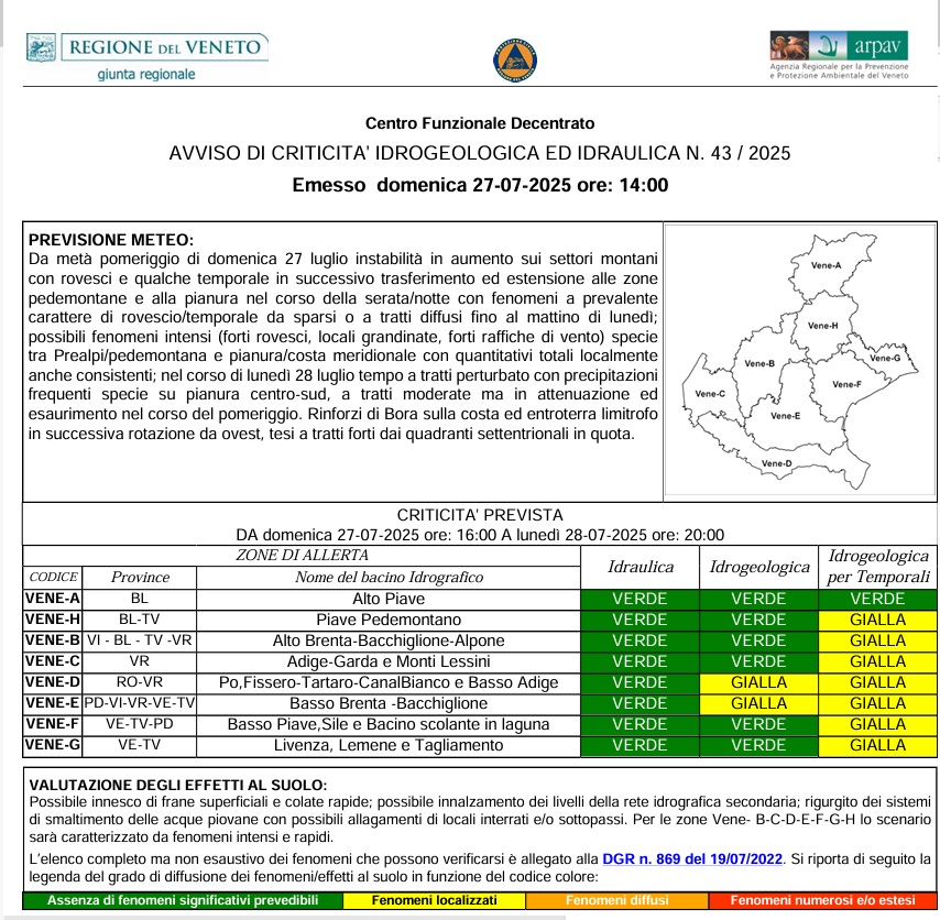 Per questo motivo è stata dichiarata l’allerta gialla (criticità idrogeologica) su gran parte del territorio regionale, ad eccezione del bacino dell’Alto Piave (Vene-A). L’allerta riguarda in particolare i bacini Po, Fissero-Tartaro-CanalBianco e Basso Adige (Vene-D) e Basso Brenta-Bacchiglione (Vene-E). La validità dell’avviso va dalle 16 di oggi alle 20 di domani, lunedì 28 luglio.