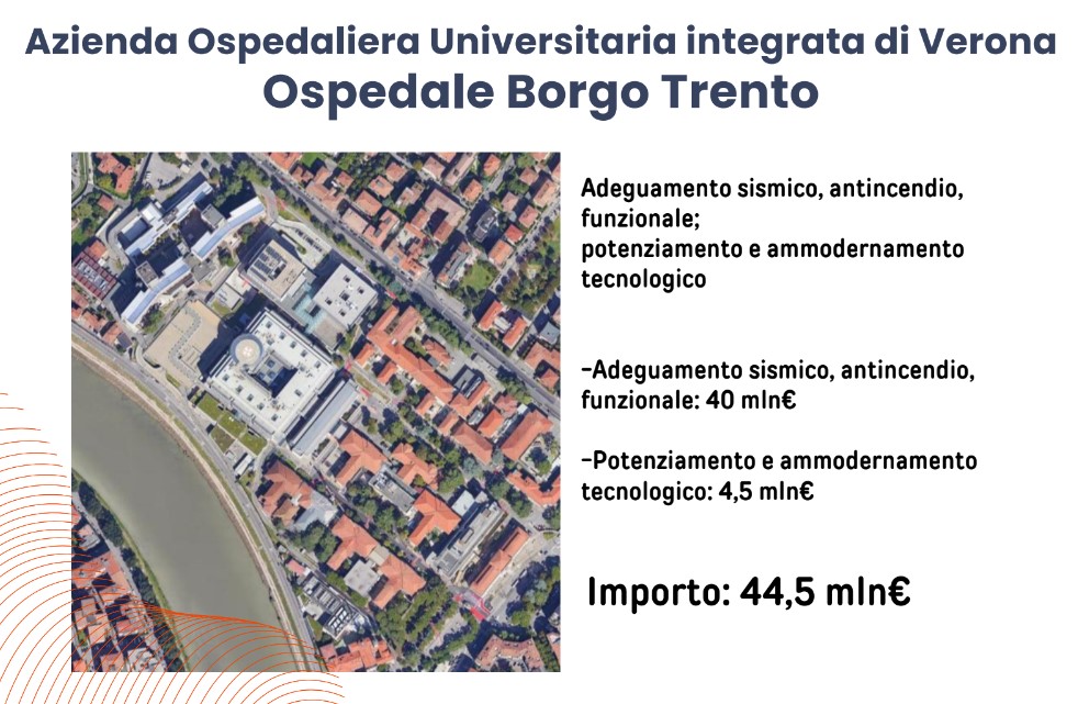 In particolare, per gli ospedali veronesi la parte del leone la fa Legnago: per la struttura della Bassa è infatti previsto un finanziamento di 100 milioni di euro, per “la seconda fase della riorganizzazione strutturale e funzionale”. Sono invece 44,5 i milioni stanziati per l’ospedale di Borgo Trento: in progetto l’adeguamento sismico, antincendio e funzionale (40 milioni), oltre al potenziamento e adeguamento tecnologico (4,5 milioni). Infine per Borgo Roma arrivano 12 milioni per “adeguamento sismico, antincendio e funzionale”.