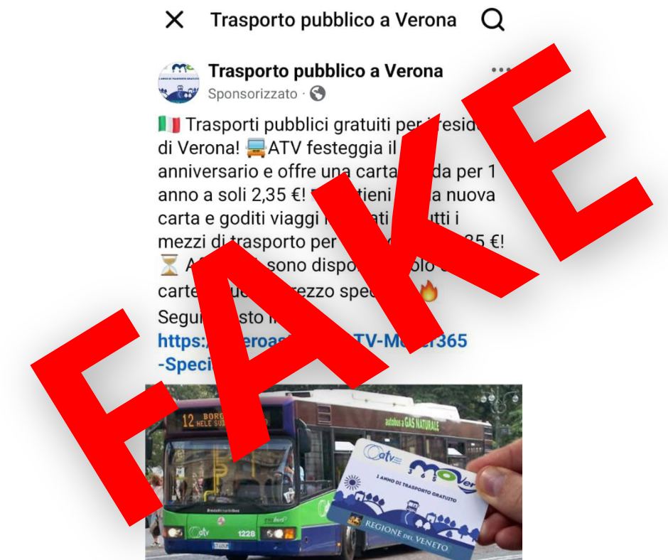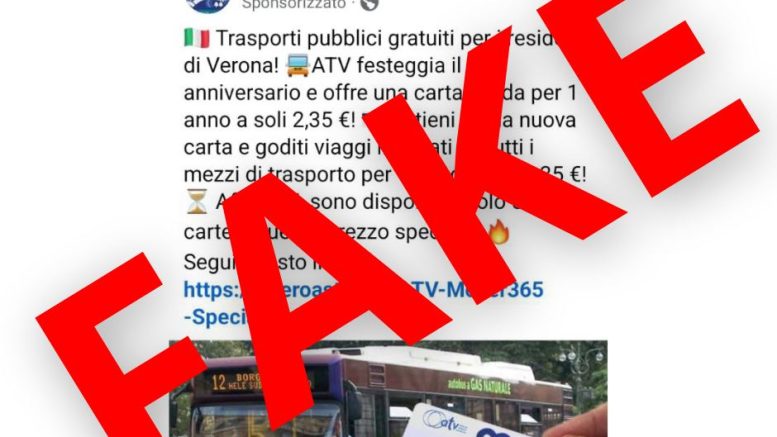 “Si segnala il profilo denominato “Trasporto pubblico a Verona” – scrive Atv – che offre una carta valida per un anno di trasporto pubblico al prezzo di 2,35 euro: è un profilo falso che espone i visitatori a una possibile truffa con richiesta di denaro. Si invita pertanto a non cliccare sulla finta promozione né tantomeno ad effettuare acquisti di tessere da tale profilo”.