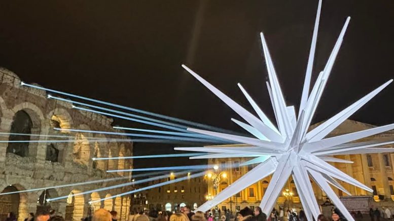 E’ stata “accesa” la coda della Stella di Natale in piazza Bra: sabato sera un fascio di luci bianche sono state proiettate verso gli arcovoli dell’Arena, creando un suggestivo gioco di luci anche grazie all’utilizzo di particolari specchi. Alla cerimonia di accensione sono intervenuti il sindaco Damiano Tommasi e anche il vescovo di Verona, Domenico Pompili.