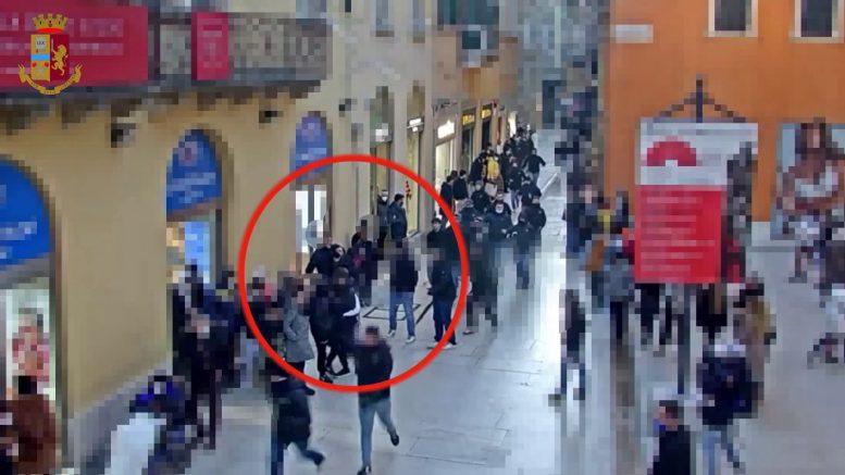 Incamminatisi in via Mazzini raggiungevano piazza Bra; alcuni, come già avuto modo di riscontrare in precedenza, erano muniti di ombrelli nonostante la giornata di sole. Approfittando dell’allontanamento momentaneo della pattuglia Digos per un altro intervento in piazza Bra, il gruppo tornava in via Mazzini e agganciava le giovani vittime all’altezza della fontanella presente dinanzi la farmacia “Due Campane”. Dopo avergli rivolto insulti e dopo averli minacciati, decidevano di passare alle vie di fatto: nel giro di pochi minuti uno dei cinque giovani veniva ripetutamente aggredito dal gruppo. Infatti, dopo aver ricevuto calci e pugni da parte di tre militanti di Casa Pound, comunque spalleggiati dall’intero gruppo, il giovane veniva nuovamente afferrato all’altezza del negozio “Grand Vision”.