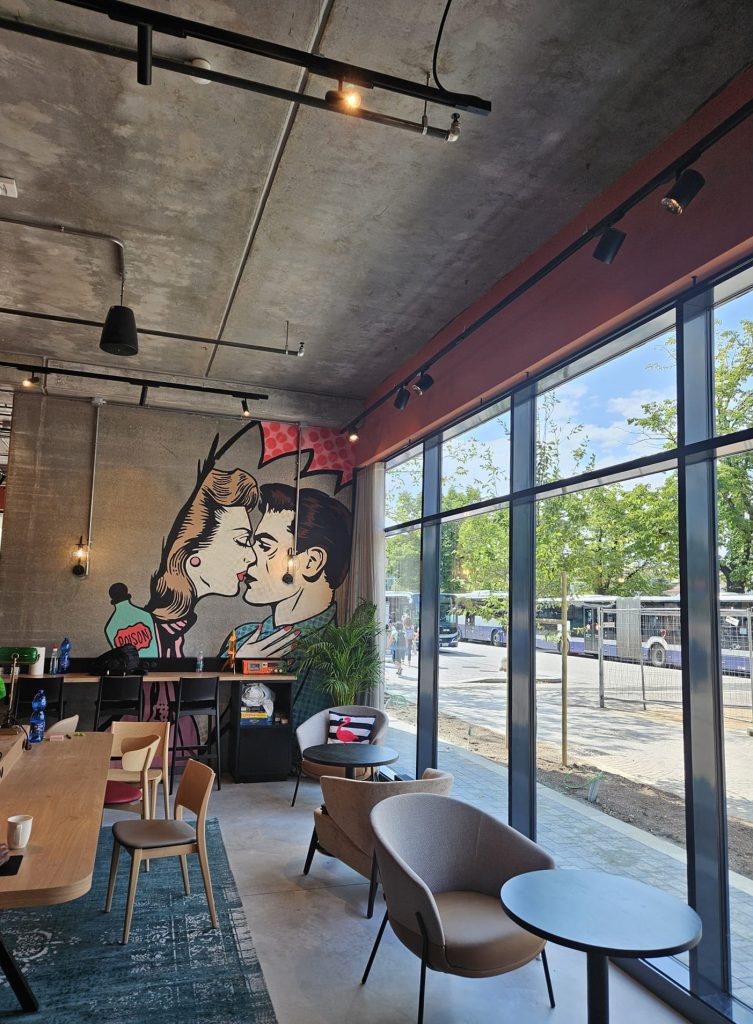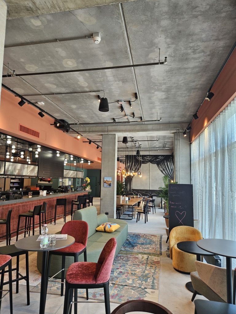 Il cuore del progetto è un sistema ibrido in legno Xlam e cemento armato. Le stanze sono realizzate con moduli tridimensionali prefabbricati, completi di impianti e finiture, mentre la hall è costruita in calcestruzzo a vista, volutamente lasciato “grezzo” per valorizzarne la matericità. A dare un tocco creativo, murales site-specific che dialogano con le superfici industriali, creando un effetto moderno e dinamico.