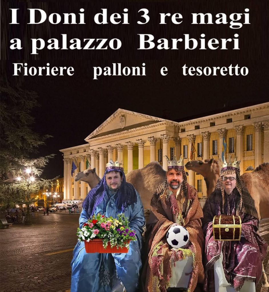 Si accende sui social il caso del fotomontaggio dei re Magi di Palazzo Barbieri: così l’assessore di Verona Federico Benini risponde alla satira. Al centro dell’attenzione c’è appunto, un fotomontaggio satirico che ritrae alcuni esponenti dell’attuale amministrazione comunale nelle vesti dei Re Magi davanti a Palazzo Barbieri, con i “doni”: fioriere, palloni da calcio e forzieri colmi di tesori.
