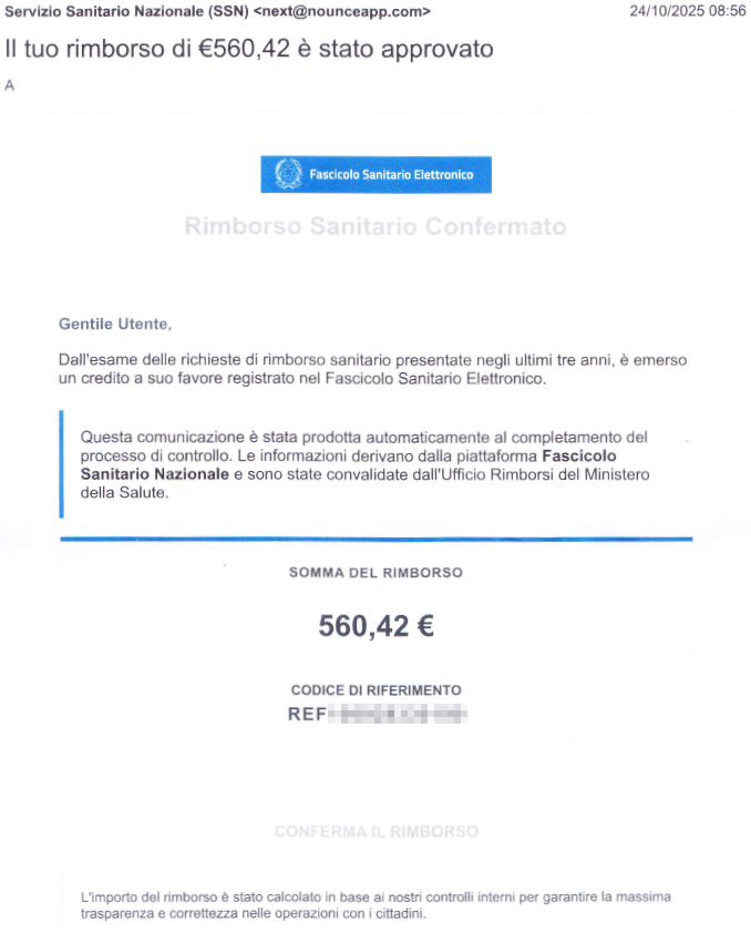 Il meccanismo è subdolo e punta sull’urgenza: una falsa email, apparentemente proveniente da un ente sanitario ufficiale, comunica all’utente l’approvazione di un fantomatico “rimborso” da parte del SSN.