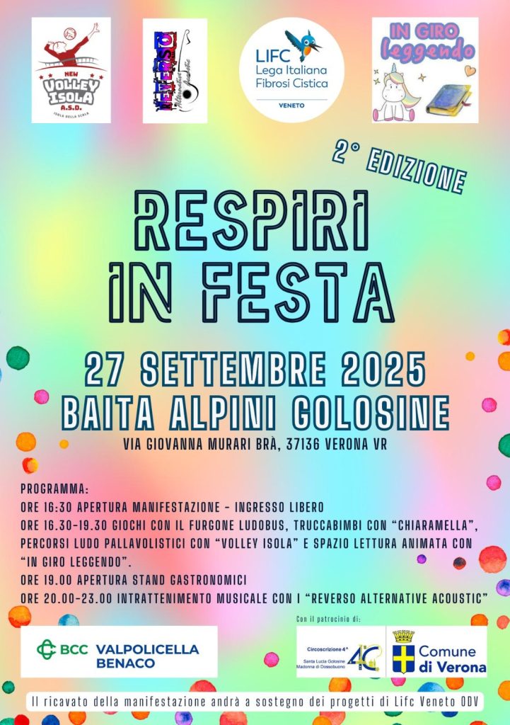 Sabato 27 settembre, l’associazione Lega Italiana Fibrosi Cistica (Lifc) Veneto odv propone “Respiri In Festa”, evento benefico a Verona. Dedicato a bambini e famiglie, si terrà alla Baita del Gruppo Alpini Golosine, in Via Murari Bra.