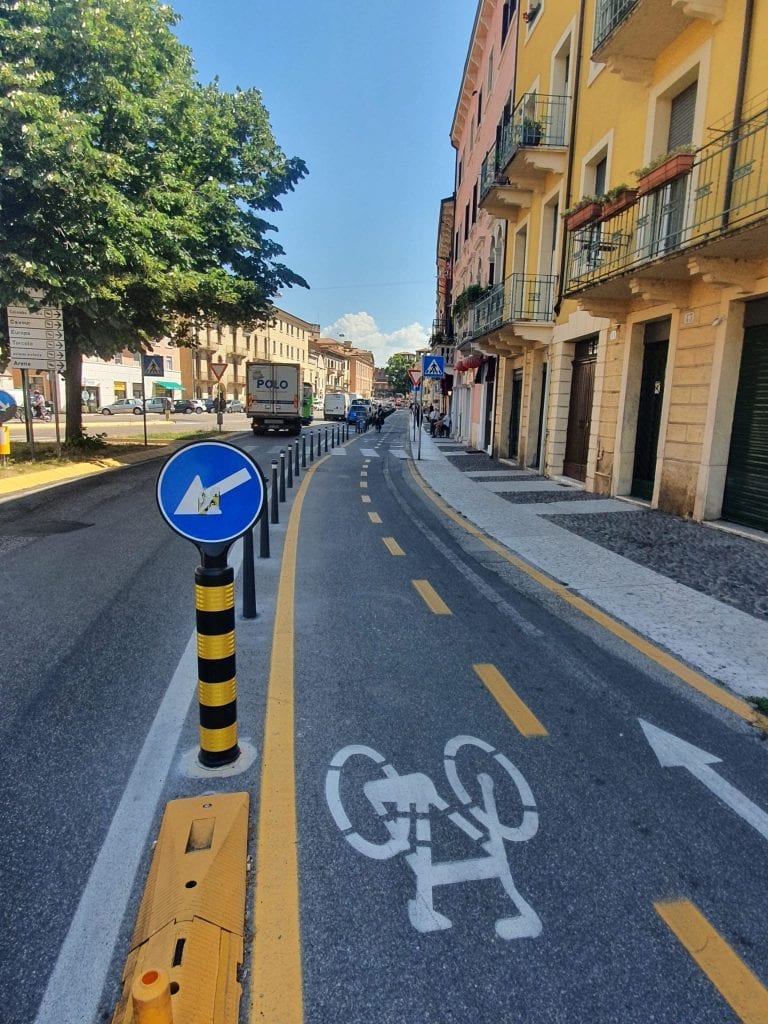 Poco più di 2 km di tragitto, in una zona della città molto trafficata sia dai mezzi privati che da quelli pubblici che, fino ad oggi, non offriva un’alternativa sicura per gli spostamenti in bici. Sul fronte della mobilità sostenibile, è il primo importante intervento realizzato negli ultimi quindici anni nella zona del centro cittadino, una risposta alle richieste di Fiab Verona oltre che alle mutate esigenze di una popolazione che, per effetto anche della pandemia, ha riscoperto i vantaggi degli spostamenti sulle due ruote.