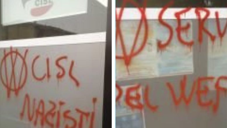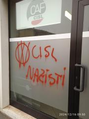 Un atto vandalico ha colpito le sedi della Cisl di Verona: questa mattina, sui vetri dell’ufficio Caf di via Grolli in Borgo Roma, sono apparse scritte. Queste sono state firmate con il simbolo “W no vax”, e accompagnate da messaggi come “Cisl Nazisti” e “Servi del Wef”, in riferimento al World Economic Forum. Si tratta del sesto attacco di questo tipo negli ultimi quattro anni, con un’escalation iniziata nel 2021, quando sono comparse le prime scritte riconducibili a movimenti no-vax.