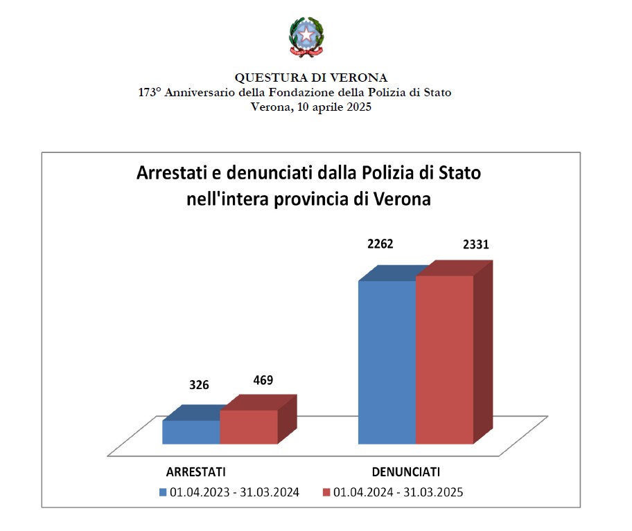 Delitti in calo, arresti in aumento: in occasione del 173° Anniversario della Fondazione della polizia di Stato, la Questura di Verona ha presentato il bilancio delle attività svolte dal 1° aprile 2024 al 31 marzo 2025, sotto il segno dello slogan “Esserci sempre”, sintesi della dedizione quotidiana degli agenti alla sicurezza della comunità.