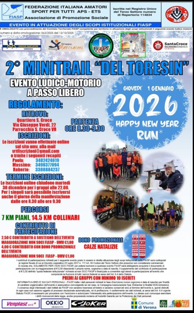 Capodanno in corsa a Verona: torna il Mini Trail “Del Toresin” per salutare l’arrivo del 2026 all’insegna dello sport e della socialità. L’Unione Marciatori Veronesi (Umv), insieme ad Asd Verona Runner Together Free, Gm Grezzana e Gm Montorio, invita la cittadinanza alla seconda edizione del Mini Trail “Del Toresin”. L’evento ludico-motorio a passo libero, ribattezzato “Happy New Year Run”, rappresenta un’occasione speciale per iniziare l’anno nuovo immersi nel panorama cittadino e collinare.