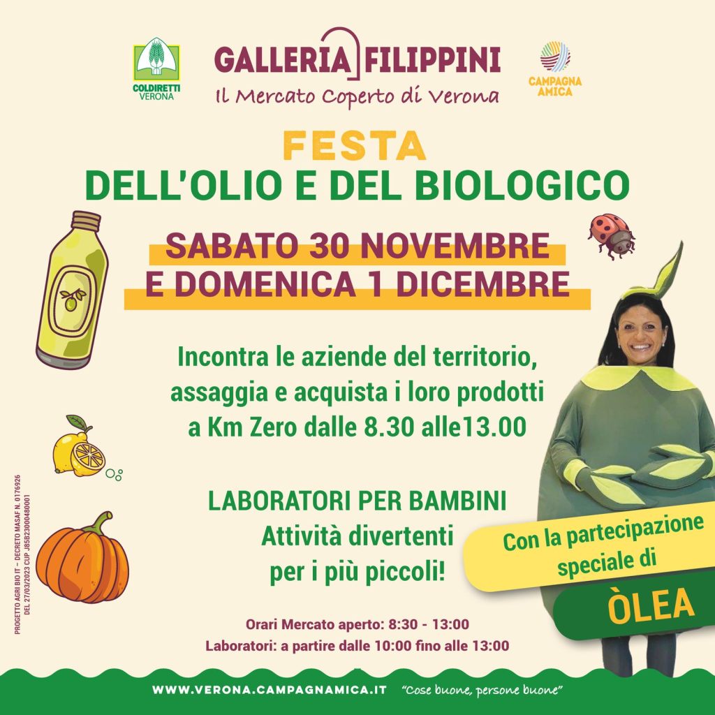 Sabato 30 novembre e domenica 1 dicembre: al mercato coperto di “Campagna Amica” a Verona, al via la festa dell’olio nuovo. Un fine settimana all’insegna del gusto attende i cittadini veronesi al Mercato Coperto in Galleria Filippini. Sabato e domenica dalle 8.30 alle 13, la Festa delle Eccellenze, con protagonisti l’olio nuovo appena spremuto e i migliori prodotti agricoli biologici di stagione.