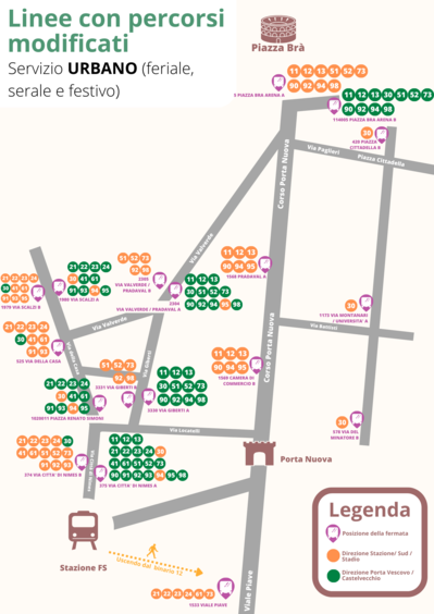 Per quanto riguarda il servizio urbano di Verona, alcune tra le principali variazioni interesseranno le linee 51-52-73 che non transiteranno più da Corso Porta Nuova ma seguiranno questo tracciato: